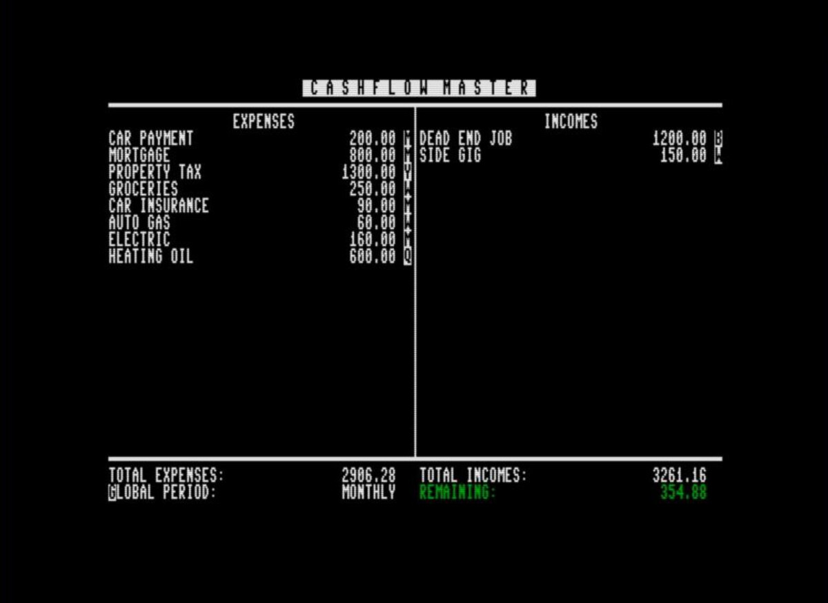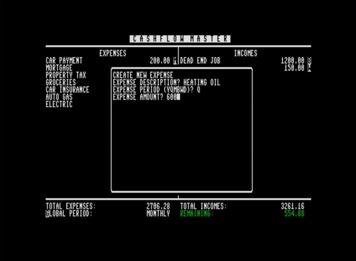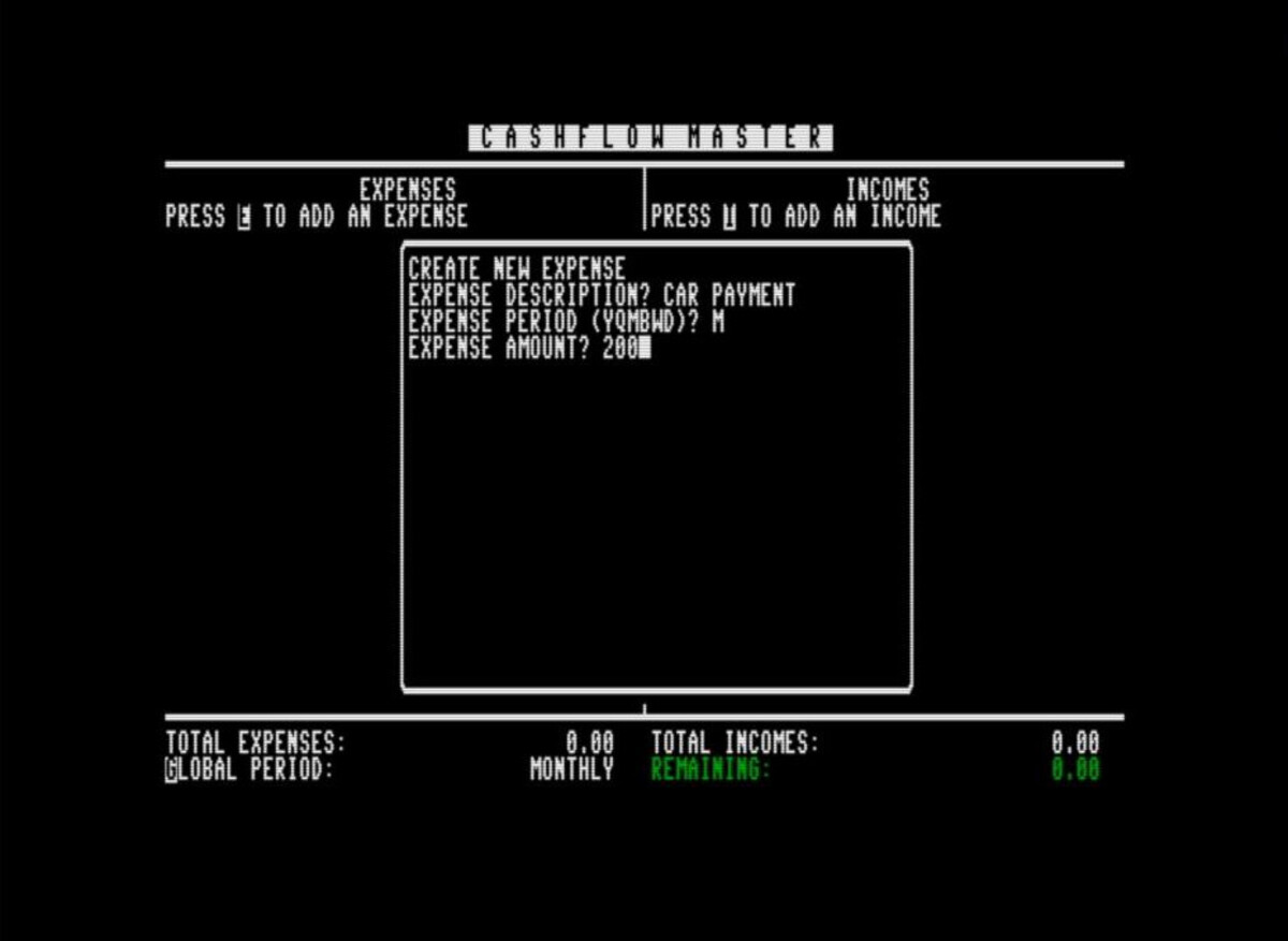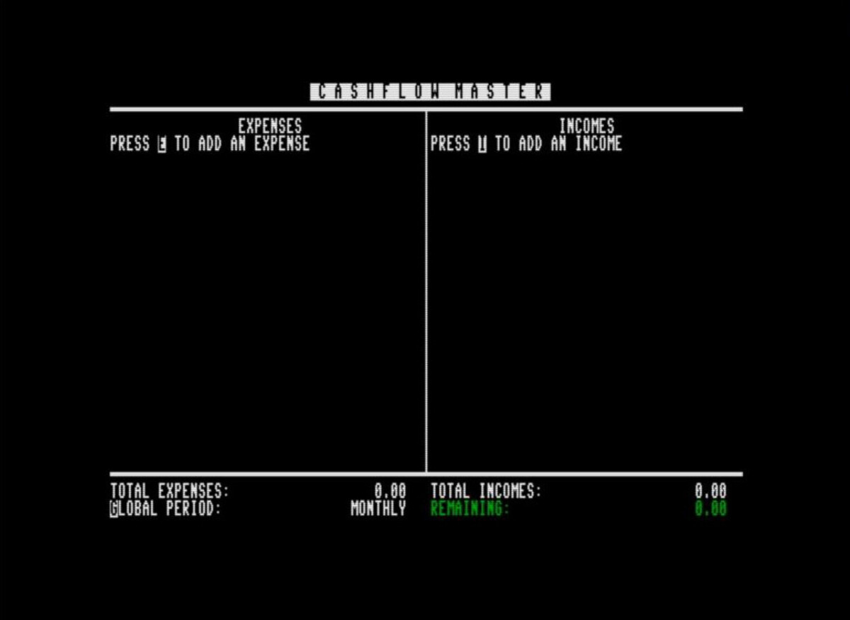 The main screen at startup presents you with a two-column table. As the on-screen instructions indicate, you can press either E or I to add an expense or income respectively. For each entry, you specify a description, an amount, and a period -- i.e., how often it recurs. Once you've entered some expenses and at least one income source, Cashflow Master will calculate your remaining cash flow per the current global period - which is indicated at the bottom of the screen. Press the G key to cycle through global period settings. The global periods available are the same ones you can specify for each income or expense -- currently: yearly, quarterly, monthly, bi-weekly, weekly, or daily. When you're done, you can press the Q key to quit and poke around the program listing if you like.