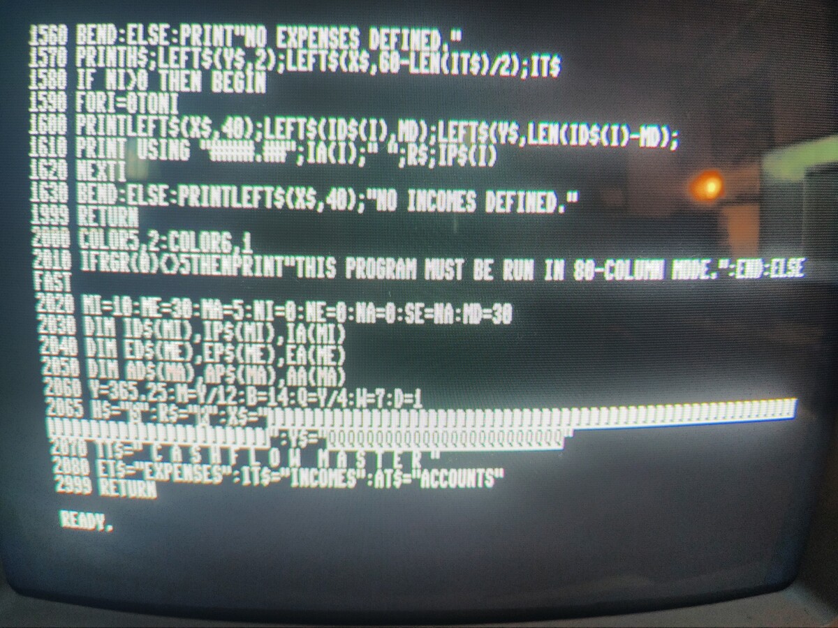 5 - 10: Jumps to initialization routines.100 - 199: The mainloop which waits for keypresses and jumps elsewhere in the program accordingly.200 - 299: The "create a new income" subroutine.300 - 399: The "create a new expense" subroutine.999: Jump here to tidy up and end the program.1000-1999: Draw the screen. (Jump to 1500, if only re-writing the tables rather than a full clear + redraw.)2000-2999: Program initialization subroutine. Sets up variables and screen colors.3000-3999: A popup-window drawing routine. This draws a frame in the center of the screen and uses the BASIC 7WINDOWcommand to set up a dialog box of sorts.4000-4040: This subroutine does all the calculation -- it adjusts each income and expense to match the global period, storing the results in two new array variables. Then the total remaining (or deficit) is calulated by summing the values in the two arrays.